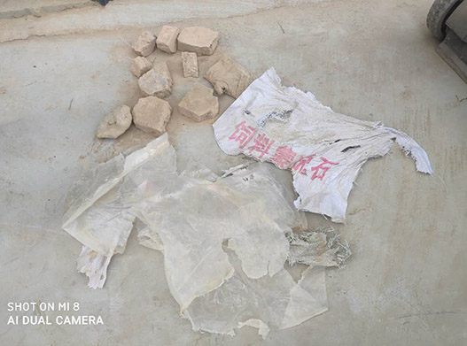 3.包裝袋不合格,這類情況一般是包裝使用的是二手大噸包,這類噸包有些有一定的爛口,為了不讓膨潤土粉末外漏,包裝工人有可能在爛口出放置塑料袋進行補漏,如果補漏的塑料袋不進行針線縫合固定,在使用膨潤土是,用來補漏的塑料袋就和膨潤土直接進入了下料口,因此就出現(xiàn)了想象不到的雜質(zhì)。